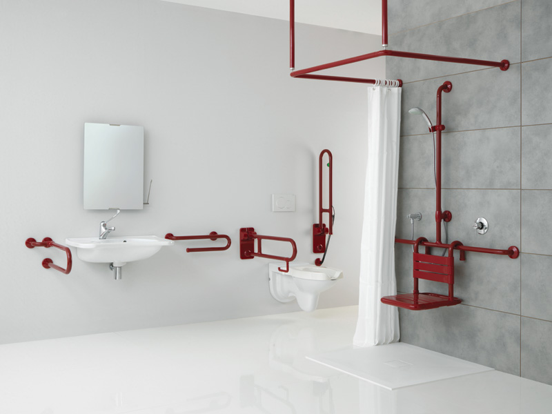 Environment that includes a practical wash basin with towel bar and drawer, a horizontal grab bar that easies movements and on which to apply a shelf and vertical piece of furniture, both removable and a big mirror (tilting on request). A chair with back rest and arm rests complete the proposal. (video)